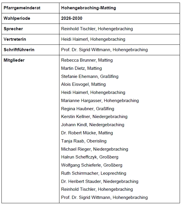 Der Pfarrgemeinderat ist ein Leitungsgremium und wird von der Pfarrgemeinde gewählt. Es bestimmt als Gremium welche Pläne in der Pfarrei verwirklicht und welche Ziele angestrebt werden. Der Pfarrgemeinderat wird von den wahlberechtigten Gemeindemitgliedern für vier Jahre gewählt.
